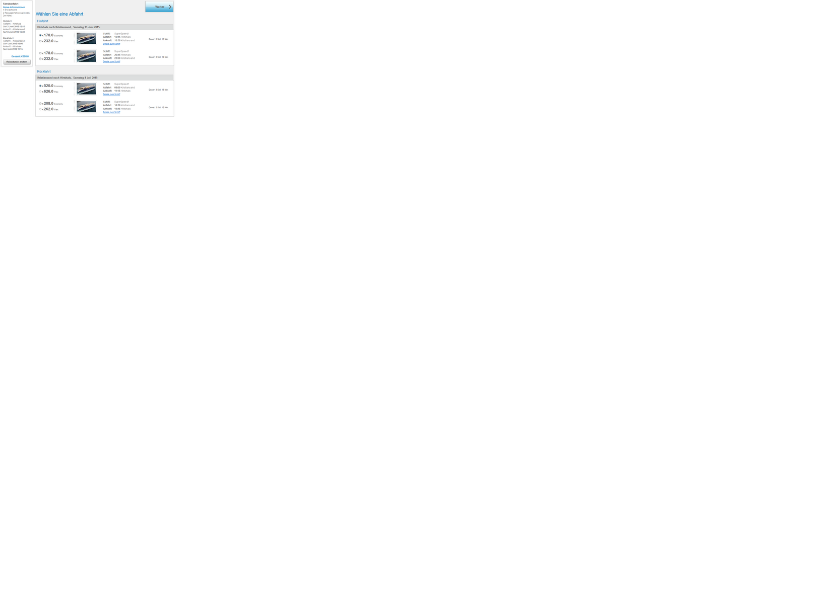 Schiff: SuperSpeed1 Abfahrt: 08:00 KristiansandAnkunft: 11:15 Hirtshals Passagiere: 2 ErwachseneFahrzeuge: 1 Passagierfahrzeug(e) (bis 2m Höhe)
