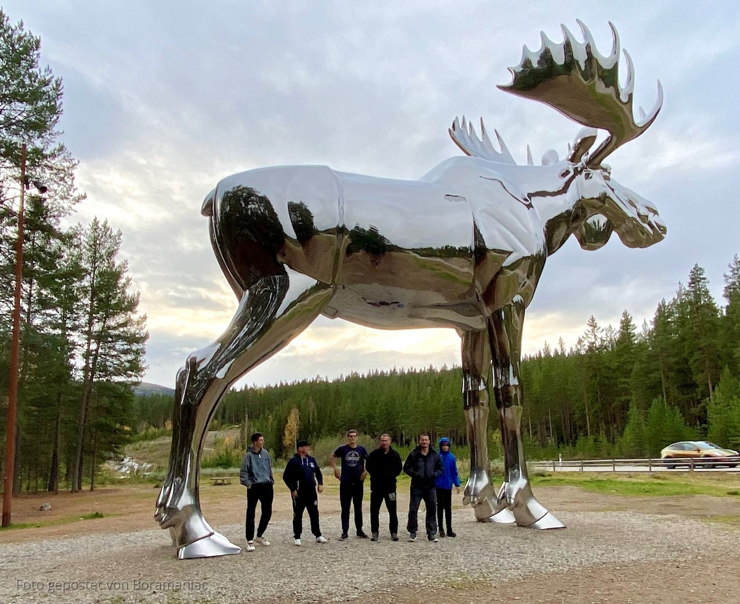 Der Samstag war der Abreise vorbehalten. Da wir ausreichend Zeit für die Rückreise eingeplant hatten, ging es mit einem kleinen Umweg über den Innfjorden - wo wir ja auch schon waren - über's schneebedeckte Fjell Dombas, zu dem verchromten Kameraden, der sein Dasein so ganz alleine am Straßenrand fristet.
