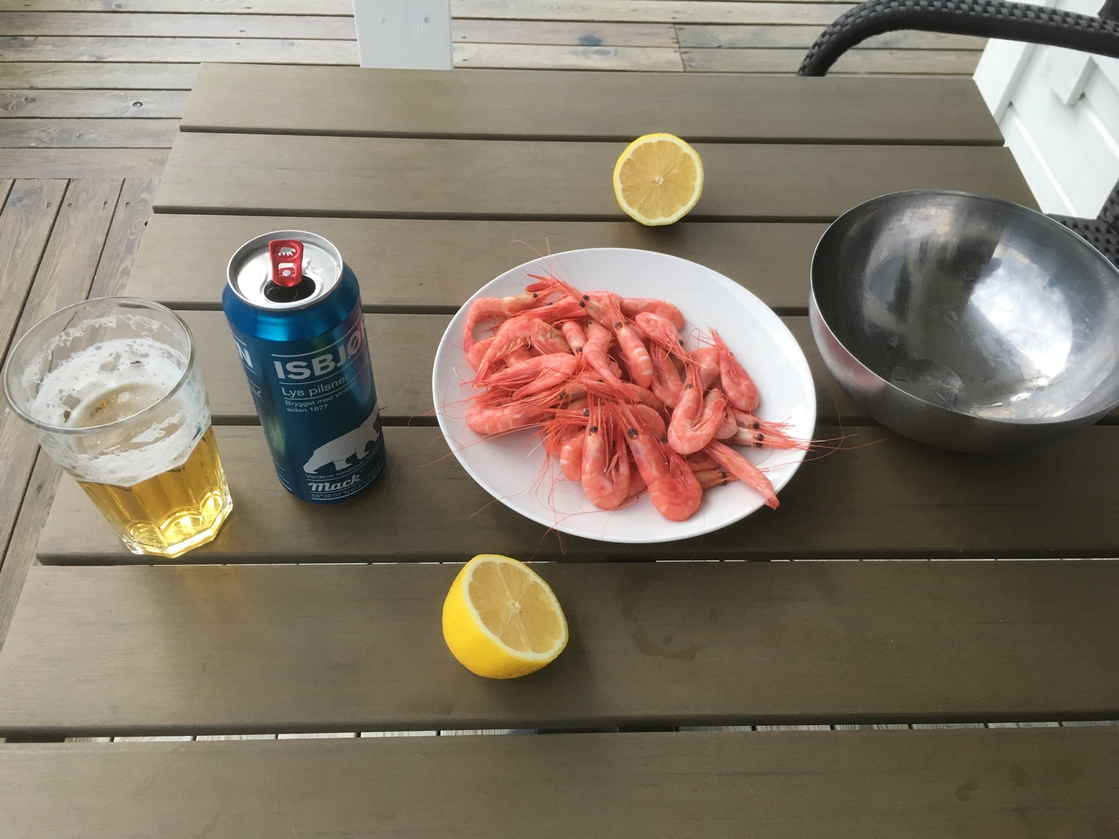 Garnelen mit Zitronen und einem norwegischen Bier.