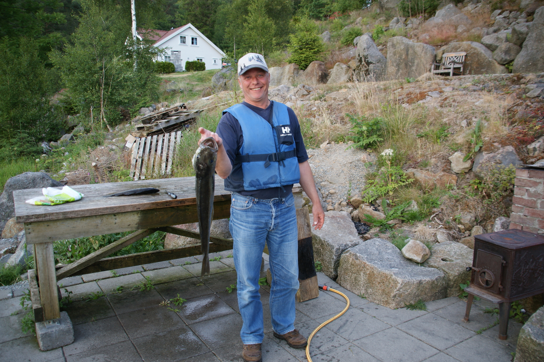Wenn du mit dem Boot raus fährst aus der Bucht dann siehst Du gerade durch eine Insel, um die Insel rum soll man köhler fangen können, ansonsten immer an den Rändern im Fjord mal probieren mit leichtem Gerät, so 75-150 gramm Pilker sollten meistens reichen.