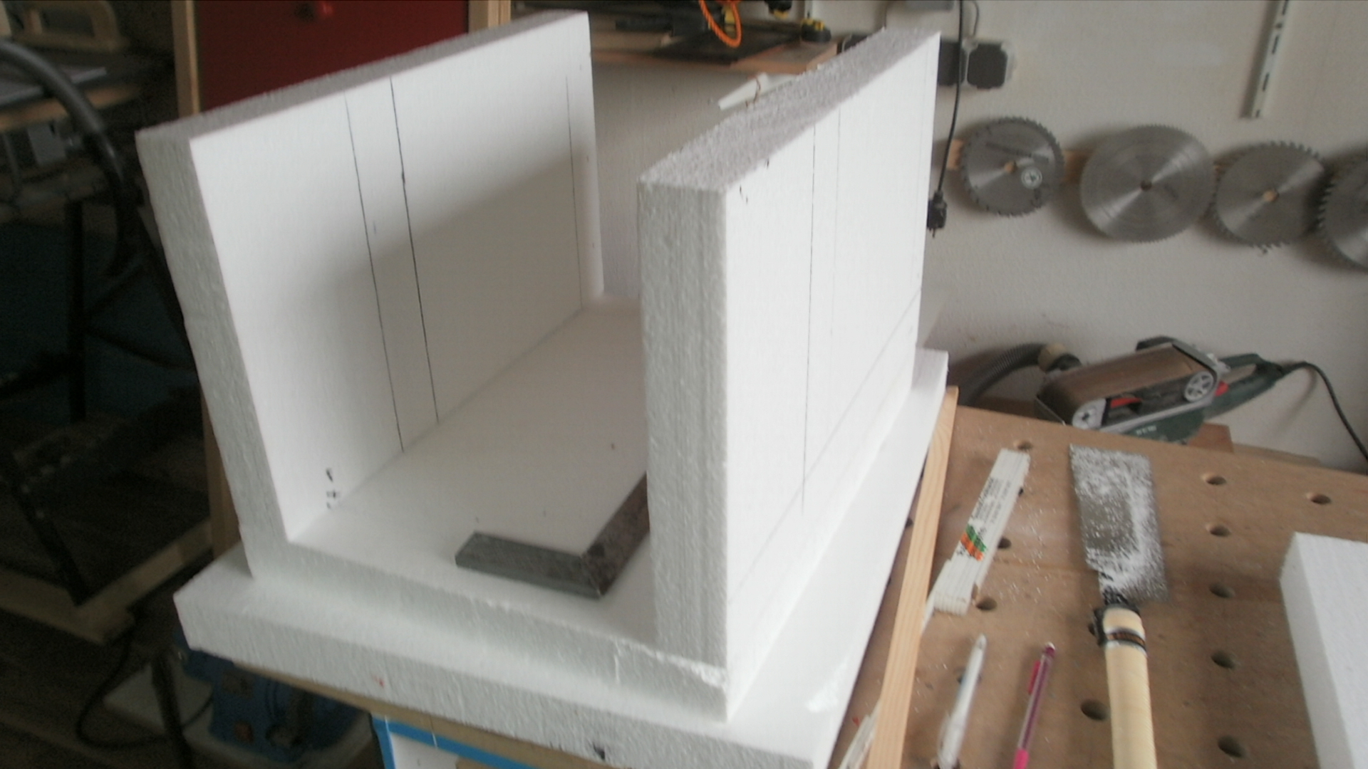 Es handelt sich um 50 mm starkes Styropor, welches ich mit Heißkleber verklebt habe. Heißkleber ist aber so eine Sache, denn ist er zu heiß, dann schmilzt das Styropor darunder.