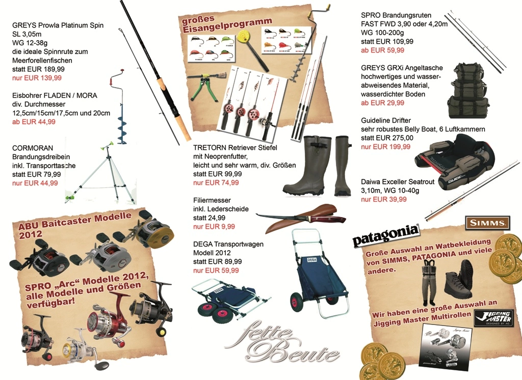 Auf Euch warten viele spezielle Weihnachtsangebote. Einzelstücke an Ruten und Bekleidung haben wir zu super Sonderangeboten im Abverkauf, denn auch unser "alter" Ladenbestand muss raus!!! Bei verlängerten Öffnungszeiten könnt Ihr in aller Ruhe stöbern.