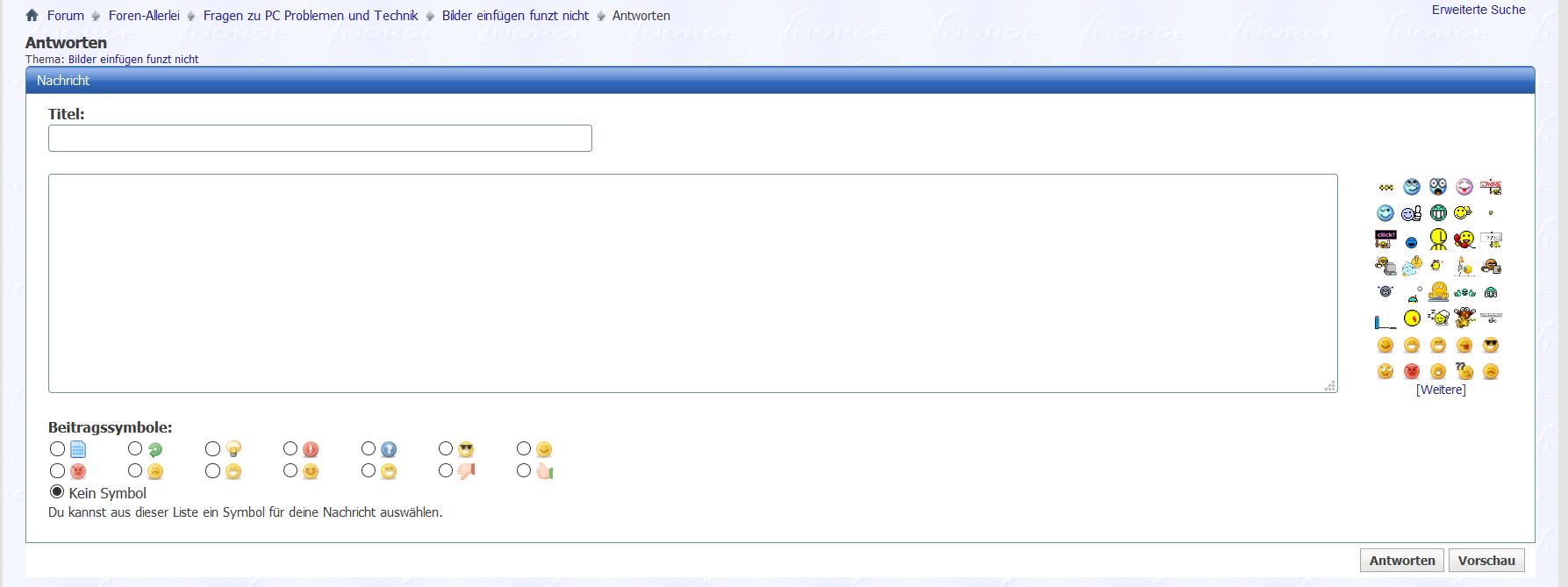 Firefox ist aktuell Im Nachbarforum funktioniert das Bildeinfügen mit den momentanen Einstellungen mühelos.