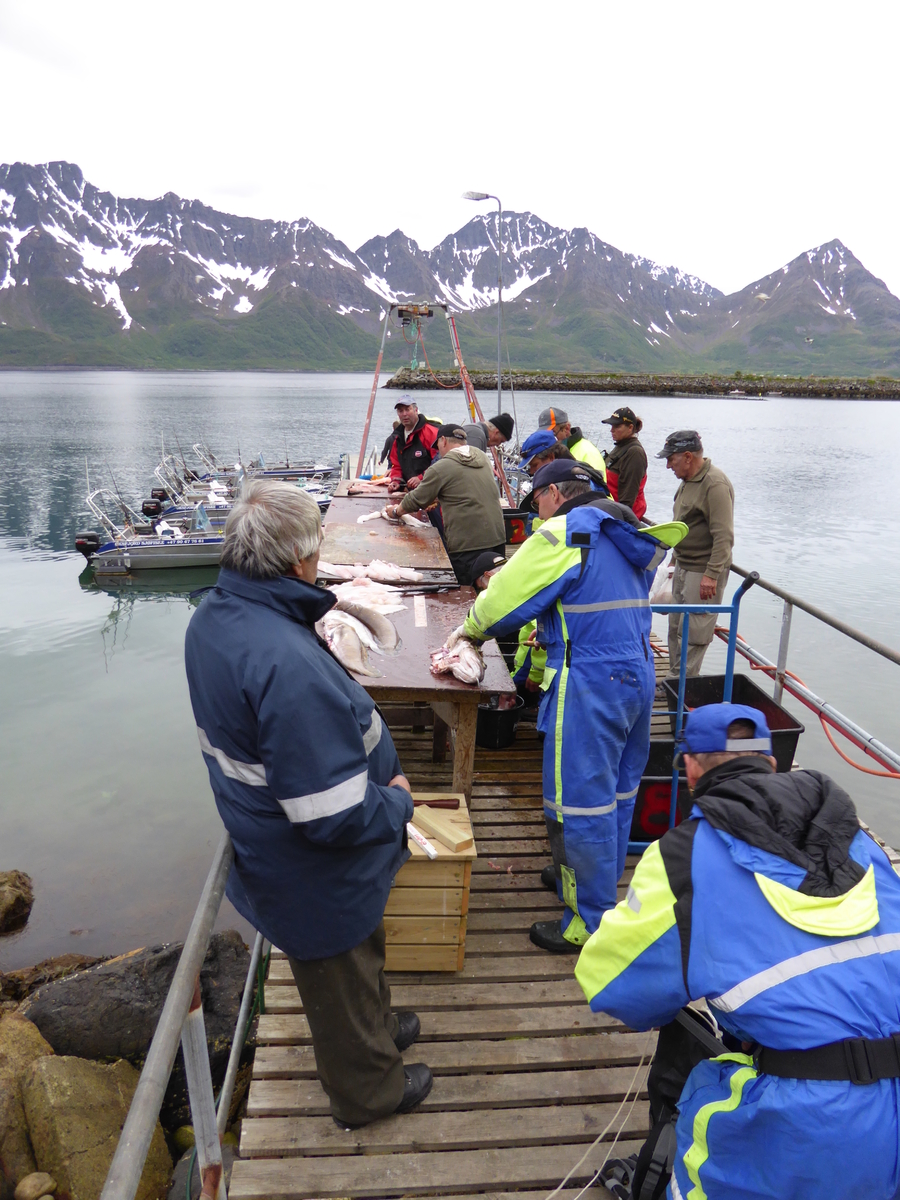 Nun wurden noch paar Erinnerungsfotos gemacht und auch Boot 11 schoß noch schöne Fotos in diesem jetzt schönen Sommerabend. Die Sonne schien über die Berge und alles passte super zusammen. Nun war es fast 22.00 und wir fuhren gemeinsam zur Anlage. Die anderen Boote kamen aus anderer Richtung, nanu? Sie waren an einer anderen Rotbarsch- Stelle gewesen. An Land zeigte sich, das auf dem Guiding-Boot zwei schöne Butts gefangen wurden und in allen Booten tolle Rotbarsche aus den Kisten schauten. Alle waren geschafft, aber total glücklich. Unser Rotbarsch war aber der Knaller, 80 cm und die Waage zeigte 7,6 kg an. Wow, JUHU.
