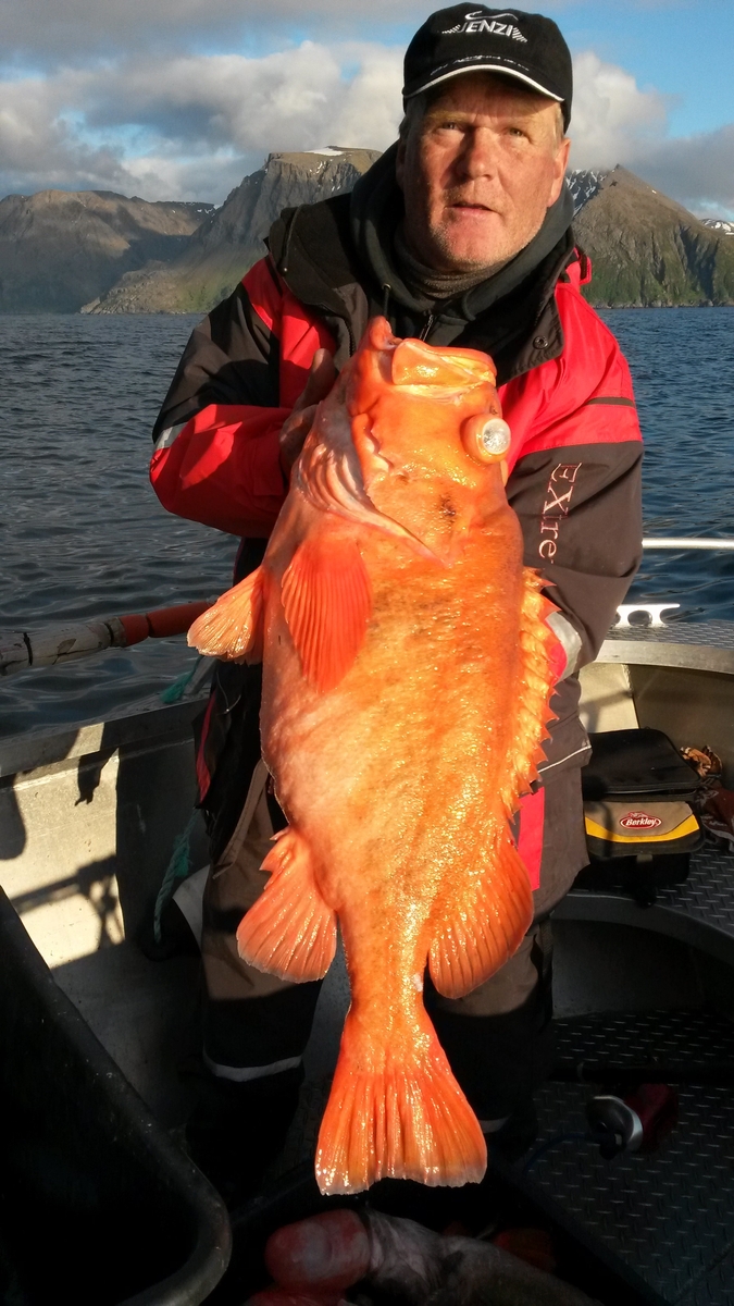 Also nach dem Betanken der Boote ging es raus auf das zweite Plateau in der Nähe der Insel Sternoya. Wir fischten in Tiefen von 40m bis 100m aber so richtig ließen sich die Fische heute nicht überreden. Ein paar Steinis und immer wieder Lumb waren die Beute nach zwei Stunden auf unserem Boot.Also ich wußte nicht so richtig, was ich heute anhängen sollte, meine Gedanken waren noch bei den Rotbarschen des gestrigen Tages und so meldetet wir uns bald vom Guiding-Boot ab und steuerten die Stelle erneut an. Heute war die Drift komplett anders, jedoch hatten wir nun die Akkus vom Knut für unsere Elektrorollen und machten ein paar Probedriften. Ja, wir trieben nicht richtig die Kanten runter, sondern etwas Quer in fast einer Tiefe .Also bei 150m angehalten und bei 150 weiter getrieben, das ist nicht so günstig. Dann sind wir ins Tiefere ab 200m gefahren und da fingen wir gleich 4 schöne Rotbarsche und mein pB. verbesserte sich auf 4kg.insgesamt waren wir 6 Stunden da und es kamen nur noch drei kleinere und ein paar Lumbe, darunter einer von mir von über 6kg in die Kiste.