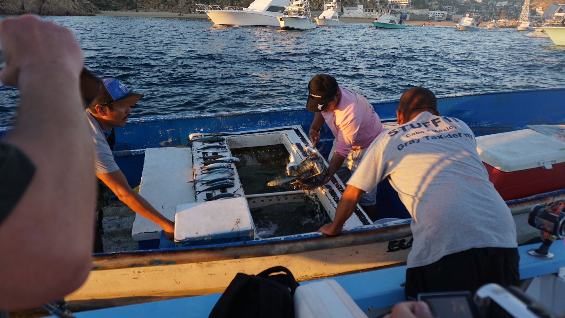 Zuerst ging es vor dem Hafen bei den einheimischen Fischern längsseits und es wurde Köderfisch gebunkert. Pro Fisch ca. 3 Dollar beim Guide. Allerdings bezahlt er die Fischer in Peso. Wir haben diese Abzocke zwar bemerkt aber stillschweigend geduldet.