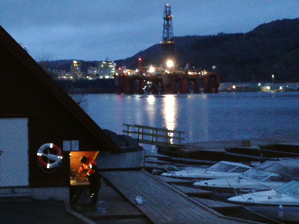Ferienhaus direkt am Wasser, das hat schon was. Die ganze Anlage ist eigentlich perfekt, auch das Green-Boot mit 25 PS ist für den Fjord völlig ausreichend. Jedoch sind touren auf die Nordsee meines erachten lebensgefährlich und deshalb haben wir intensiv den Fjord beangelt. Unser Ausblick auf den Fjord....naja, es lagen da 2 Bohrinseln und mehrere große Schiffe an der gegenüber liegenden Werft. Das war schon störend....hätten auch im Hamburger Hafen angeln können (und wahrscheinlich mehr gefangen, aber dazu gleich).