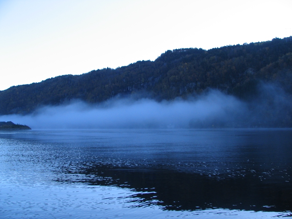 Wir sind dann mal weiter hinter in den Fjord gefahren. Auf der rechten Seite hatten wir massig Echolot- Anzeigen in allen möglichen Tiefen. Ich wollte aber mal hinter in die Bucht, um zu sehen, was da so los ist. Dabei ist uns ein schönes Foto vom Morgennebel über der Kvina gelungen. Leider war in der Bucht nicht viel los und an die richtigen Stellen sind wir vom Wasser aus nicht rangekommen, da hier nach wie vor alles voll mit Treibgut ist, was uns eh schon die ganze Zeit nervt. Gott sei Dank, ist es auf dem Fjord selber nicht mehr so schlimm.