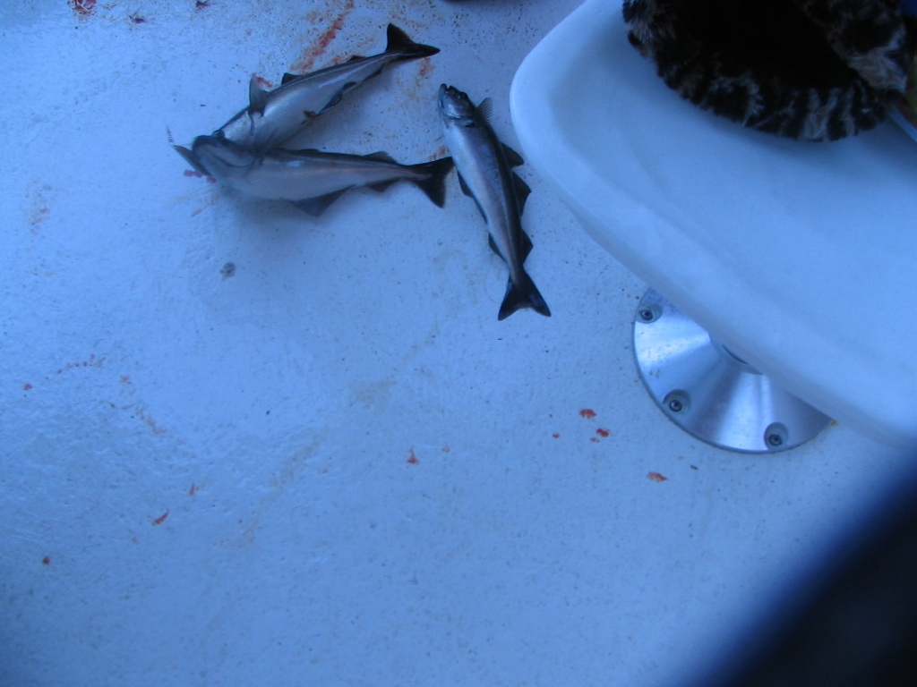 Mittlerweile waren fast alle Neuangereisten um uns versammelt. Man konnte ja richtig Platzangst kriegen! Wir haben also unser Maschinchen angeworfen und sind auf der linken Seite fjordauswärts gefahren und haben verschiedene Kanten getestet und schließlich auch eine gefunden, wo wir noch einige Makrelen, Kleinköhler für die Suppe und auch zwei Minidorsche verhaften konnten. Die Dorsche gingen selbstredend wieder zurück, aber die anderen liegen jetzt schön aufgereiht in der Gefriertruhe. Insgesamt waren das heute also 11 Fische. Verglichen mit den bisherigen Versuchen also eine gewaltige Steigerung. Man muss auch bedenken, dass wir inkl. An- und Abfahrt nur gute drei Stunden unterwegs waren.
