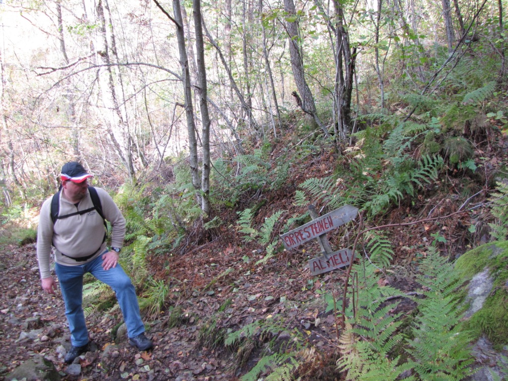 Für den Nachmittag hatten wir uns eine Wanderung zum Orresteinen vorgenommen, also ging es gegen halb zwei los. Denn Einstieg hatten wir dank Bezets guter Beschreibung auch schnell gefunden und auch der erste Wegweiser (Bild) tauchte bald auf. Zuerst „bestiegen“ wir den Geiteknuten (Bilder) und folgten dann immer weiter dem Hauptweg. Leider kam kein Wegweiser mehr und es wunderte uns schon, dass es eigentlich immer so eben dahin ging. Zwischendrin kamen immer mal ein paar Felsen, von denen man wirklich geile Aussichten auf den Fjord hatte. Das sind die über der Bucht vorm Hafen. Leider war aber von unserem Orresteinen nix zu sehen. Wir wähnten uns aber nach wie vor auf dem richtigen Weg, da er hangseitig mit Felsbrocken ausgebaut war und später sogar die Artefakte eines Geländers (eingemauerte Pfosten ohne Handlauf) auftauchten. Selbst ein Autositz (Bild) und ein altes Fenster tauchten neben dem Weg auf. Und dann war plötzlich Schluss! Wie abgehackt endete der Weg ein Stück über der Straße. Ich habe mir das später mal auf einer Luftaufnahme angeschaut und mir wurde klar, was passiert war. Der Weg endete genau auf dem Felsen kurz vor der Werft, der irgendwann mal wegen der Straße gesprengt wurde. Damals ging er wahrscheinlich auf der anderen Seite weiter.