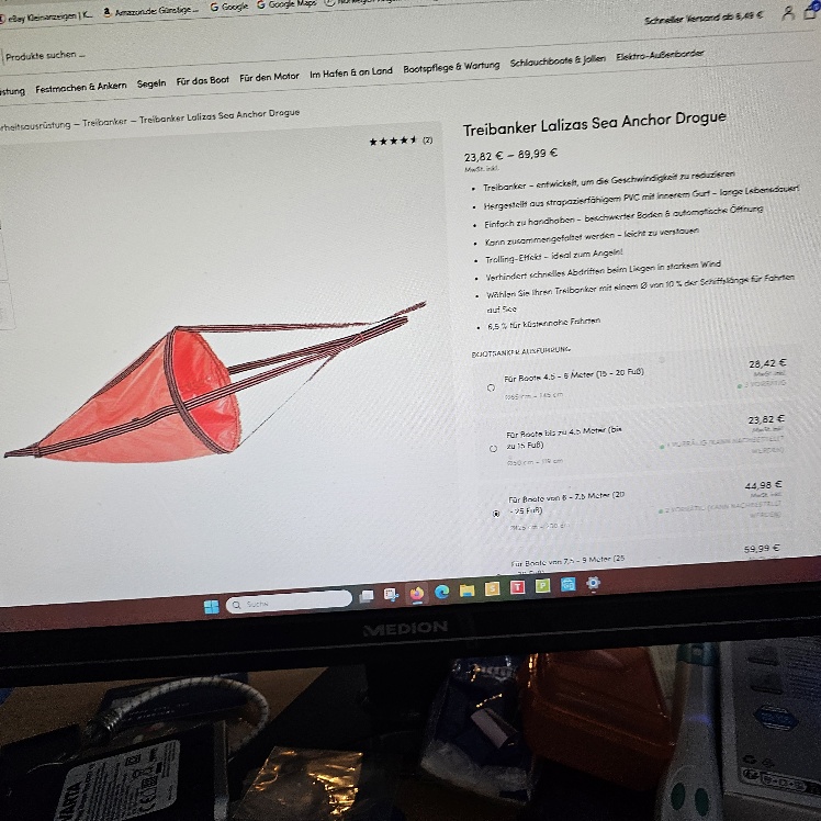 Ich habe einen neuen Driftanker / Treibanker der Marke Lalizas , der zwar 1 x in Norwegen war, aber nicht im Einsatz. Für Boote von 6 - 7,50 m, 25 ft. Details entnehmt bitte den Fotos. Mein Preis ist 29,-- € zzgl. Versand.