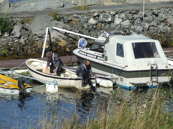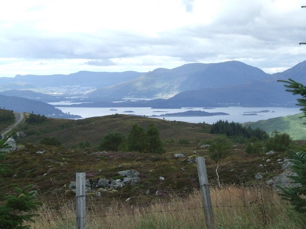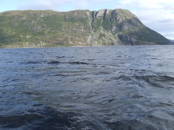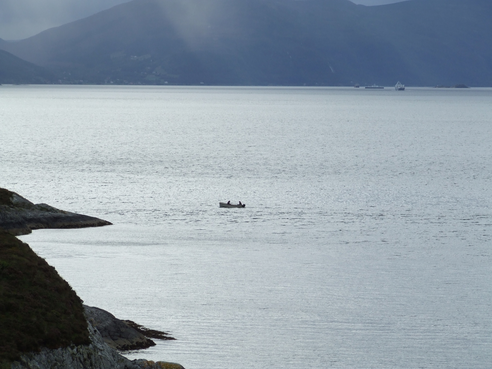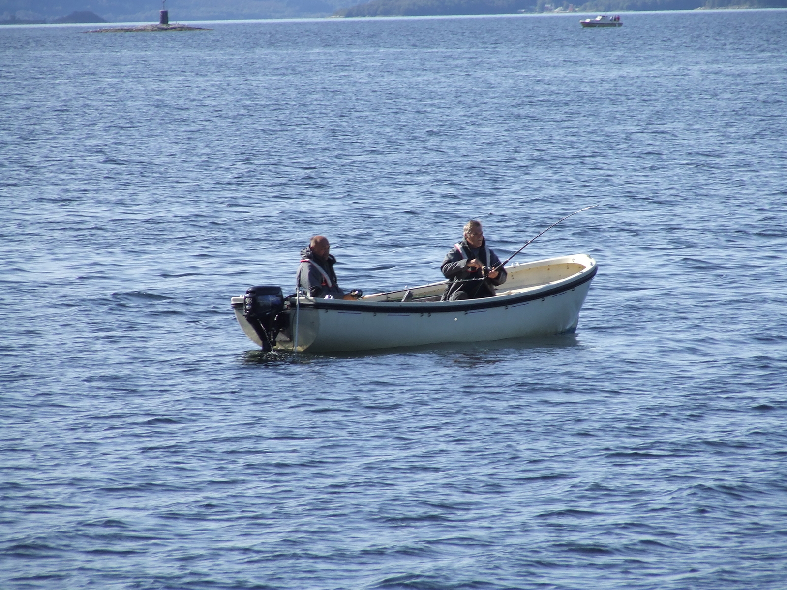 Jetzt ging der Urlaub richtig los, mit Angeln, Angeln und noch mal Angeln, Wanderungen ins Gebirge in unserem Rücken (mit fantastischen Ausblicken über den Fjord bis zum Atlantik), das sich bis auf über 1000m auftürmte. Die Frauen erkundeten die nähere Umgebung, während wir auf dem Wasser unterwegs waren. Das Boot war ein 17 feet Ruderboot mit 10Ps Außenborder und Elektrostarter. Wir sind nie als Schneider vom Wasser gekommen, aber der ganz große Fang blieb uns versagt. Man muss sich aber auch erst einmal an die Wassertiefen von bis zu 400m im Fjord gewöhnen. Das ist doch ein etwas anderes Angeln als bei uns in der Ostsee. Wir haben jede Menge verschiedene Fischsorten gefangen, Dorsch, Köhler, Leng, Rotbarsch, Makrelen und Petermännchen, aber leider nicht die ganz großen. Zwei Dorsche von 65 cm und ein Leng von 70 cm waren die größten Exemplare, alles anscheinend Einzelgänger, wir hatten nie einen Schwarm sondern immer nur einzelne Bisse. Unsere Pilker mit 200-250 Gramm waren bei einsetzender Flut oder Ebbe natürlich viel zu leicht, also wurden 2 hintereinander geschaltet, dann ging es einigermaßen. Die 12 Systeme die wir versenkt haben ließen sich gerade noch verschmerzen, von denen mein Angelpartner alleine 10 versenkte. An drei Tagen war an eine Ausfahrt überhaupt nicht zu denken, Sturm und Regen wie aus Kübeln, aber auch die konnten die super Urlaubsstimmung nicht trüben. Wir hatten herrliche 2 Wochen, die leider wie immer viiiiiiiiiiiiel zu schnell vergangen sind. Wir hatten „nur“ etwa 20 kg Fisch in der Kühlbox, was uns aber auch nicht weiter betrübte, denn wir sind ja nicht nur wegen des Fisches nach Norge gefahren.