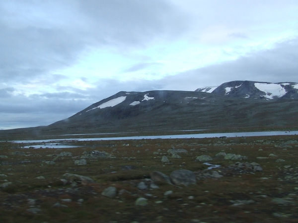 Jetzt waren es ja „nur“ noch 647 km, wie lang die in Norge sein können sollten wir bald merken. Zwischen 4°° und 5°° Uhr hatten wir eine Begegnung der besonderen Art, da steht doch ein Elch am Straßenrand und schaut uns mit großen Augen an, so nach dem Motto „Hier kommt doch sonst um die Uhrzeit nie ein Auto her“. Nach dem ersten Schrecken und ausweichschlenkern, haben wir den Anblick genossen, es war nur leider zu dunkel zum Fotografieren. Um 8°° Uhr waren wir alle so erschlagen, das wir eine längere Frühstückspause einlegen wollten, der Laden macht aber erst um 9°° Uhr auf, also erst einmal eine Stunde ein Nickerchen im Auto gemacht und dann richtig gut und ausgiebig Gefrühstückt. Wir schraubten uns langsam bis auf 1.400 m hoch und erlebten eine Landschaft wie von einem anderen Stern, so etwas hatten wir bisher noch nie gesehen, trotz ihrer Kargheit (kein Baum, kein Strauch) fasziniert diese Landschaft mit endlosen Geröllfelder und schneebedeckten Bergen. Dann ging es durch unzählige Tunnel weiter Richtung Rovde. Um 17°° Uhr waren wir endlich da.